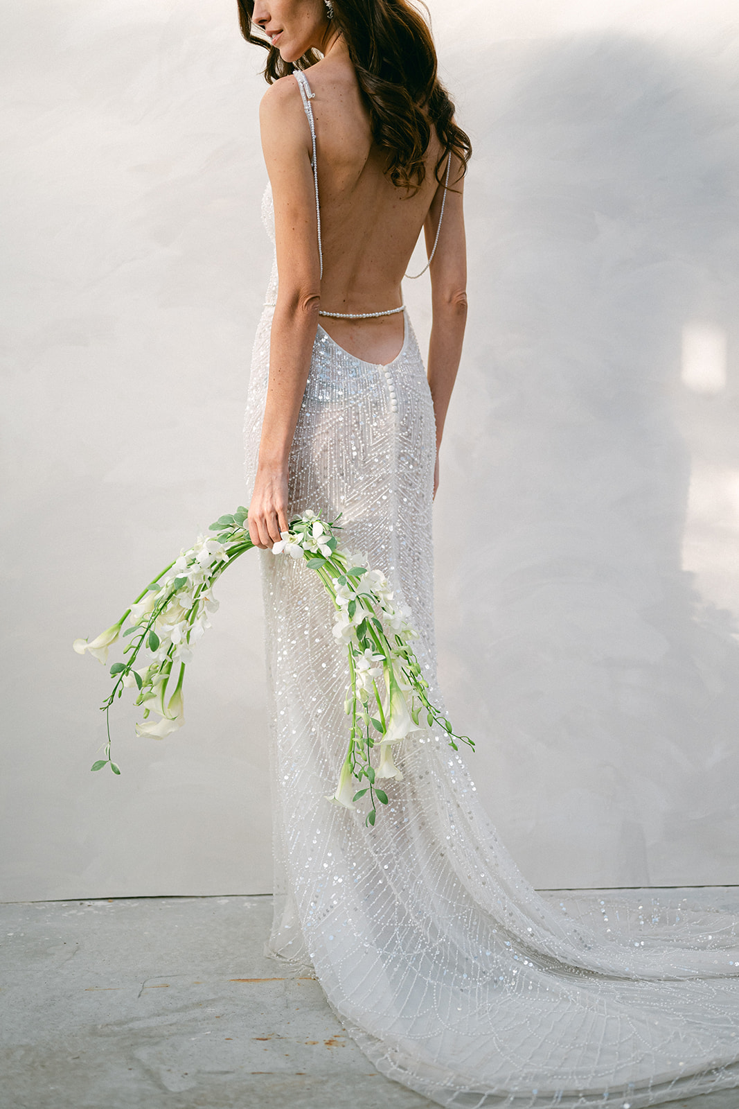 -Une composition spectaculaire portée dans le dos comme un bijou végétal. Callas, Orchidées blanches et Dahlias crème s’unissent dans une cascade florale élégante, évoquant une traîne moderne. Idéal pour une mariée tendance, audacieuse, à la recherche d’un bouquet couture.