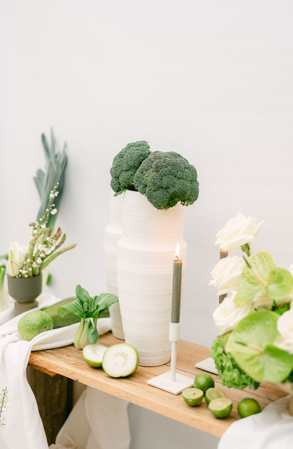 Exit les décors figés et sans âme. En 2025, les shootings floraux mettent à l’honneur la richesse des textures et l’opulence végétale. Les roses s’entrelacent avec les artichauts, les anthuriums s’amusent aux côtés des grappes de raisin, tandis que les choux se transforment en véritables sculptures organiques. Fruits et légumes deviennent des alliés esthétiques, apportant du volume, de la couleur, une touche d’originalité , voire d’humour , à chaque composition florale.