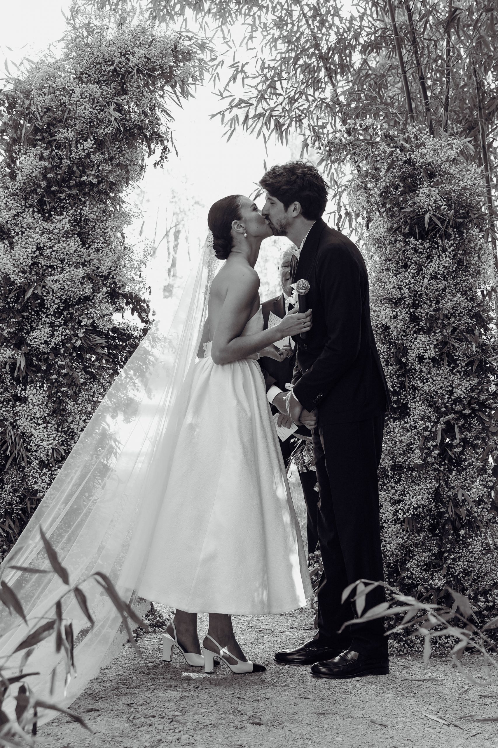 Dès l’arrivée, les invités ont été accueillis par une allée bordée de gypsophile vaporeux, de feuillage séché, dans une bambouseraie. L’effet ? Une atmosphère presque suspendue, hors du temps, où la nature semblait se prolonger jusque dans la scénographie. Entourée de verdure et baignée de lumière, Emma a rejoint Clément pour dire « oui » à l’amour de sa vie.